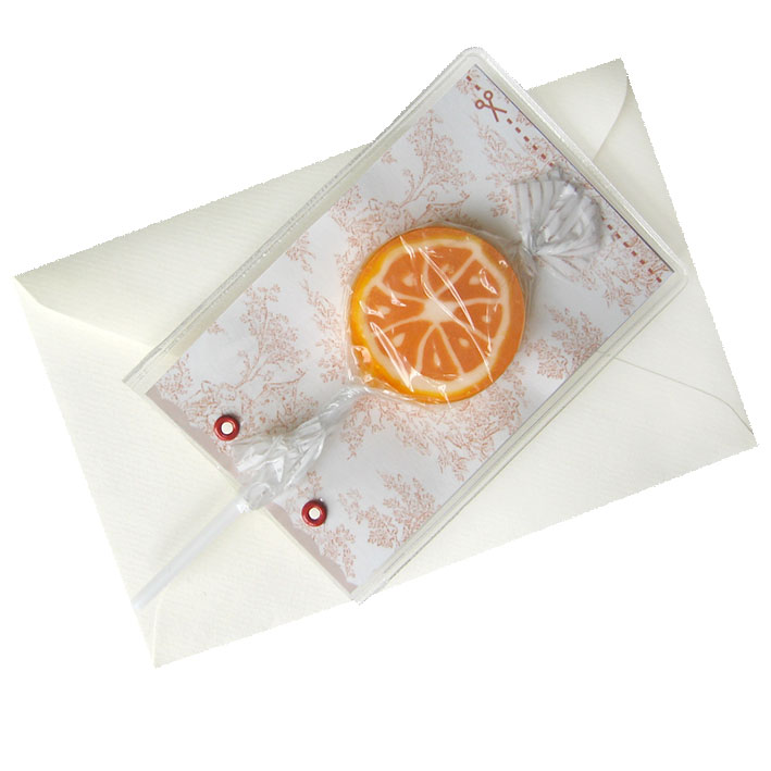 Sucette parfum orange dans sa housse plastifiée avec oeillets fantaisie ronds et fleurs. Ces faire-part sont livrés montés et avec leurs enveloppes.