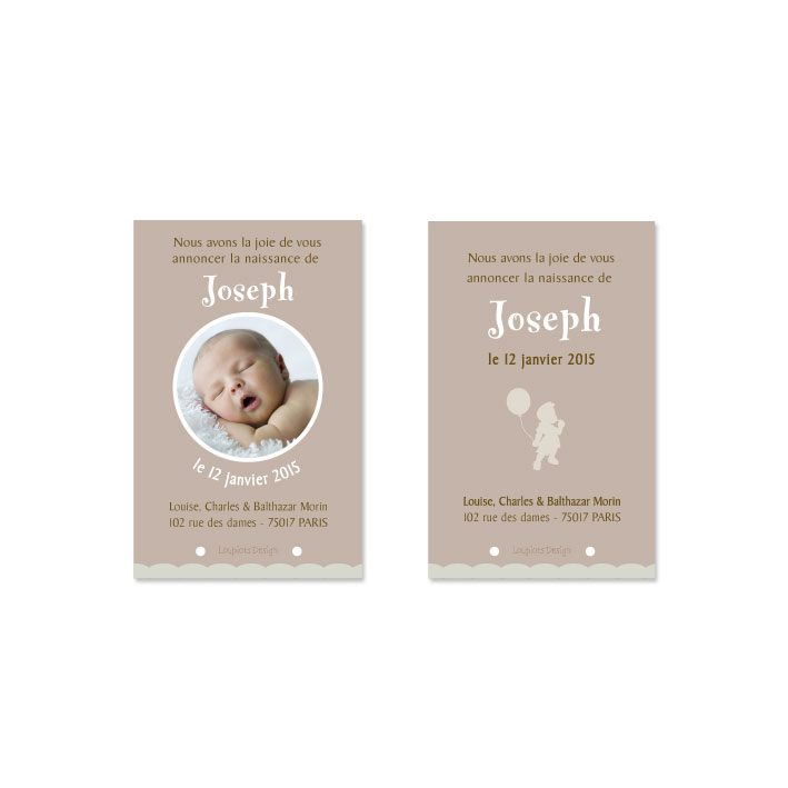 Verso sans photo : Nous avons la joie de vous annoncer la naissance de prénom de l’enfant, 1 photo, le date de naissance,